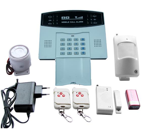 1 main panel, 1 wireless PIR detector, 1 wireless door sensor, 1 siren, 2 remote controllers, 1 power supply, 1 manual